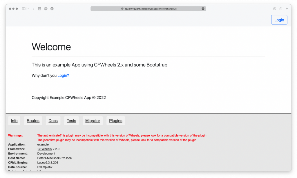 So what do those commands do for us. The first line is the longhand way to install a fresh CFWheels app using one of the published templates from Forgbox.io. This command gives the application a name, sets up a datasource, and configures it to use the built in H2 database in the Lucee CF Engine. (Are you wondering, wait, Lucee has a built in database engine?) The next line installs all our development and production dependencies into our application directory. Lastly we start the Lucee server and the application launches in our default browser.